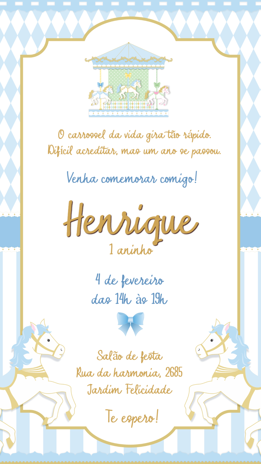Celebre um momento mágico com este encantador convite de aniversário com tema carrossel! O design delicado em tons de azul, branco e detalhes dourados cria uma atmosfera de sonho, perfeita para comemorar o primeiro aninho ou festas infantis. Personalize você mesmo de forma fácil e rápida! Edite online em minutos: adicione o nome do aniversariante, a idade, a data, o horário e o local da festa. Sem complicações, você cria um convite único e especial. Após a edição, o download é imediato! Receba sua arte em alta qualidade, pronta para enviar pela internet para amigos e familiares ou para imprimir e entregar em mãos. Crie uma memória inesquecível desde o primeiro convite