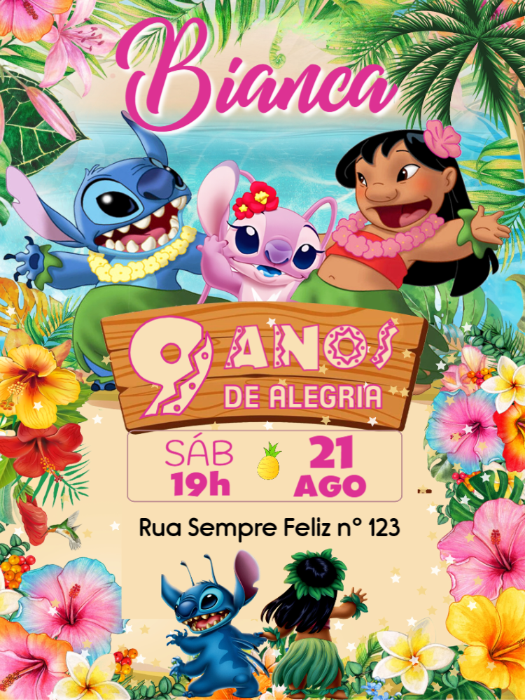 Prepare-se para uma aventura tropical! Este convite de aniversário com o tema Lilo e Stitch é perfeito para uma festa cheia de alegria e diversão. Com um design vibrante e colorido, destacando os personagens mais queridos, ele vai encantar todos os seus convidados. Edite online de forma rápida e fácil! Personalize com o nome do(a) aniversariante, idade, data, horário e local da comemoração. Após a edição, seu convite fica pronto para baixar na hora, em alta resolução. Ideal para enviar pelas redes sociais, por aplicativos de mensagens ou para imprimir e entregar em mãos. Crie agora mesmo um convite único e prepare-se para uma celebração inesquecível no estilo havaiano