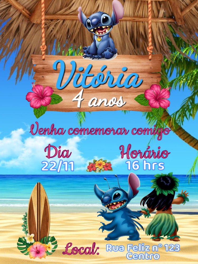 Celebre com a magia do Havaí! Este convite de aniversário do Stitch e Lilo é perfeito para uma festa tropical inesquecível. Com um design vibrante na praia, com os personagens favoritos da criançada, ele vai encantar todos os seus convidados. Personalize online em minutos! É muito fácil: adicione o nome do(a) aniversariante, a idade, a data, o horário e o local do evento. Após finalizar a edição, seu convite fica pronto para baixar na hora. Perfeito para compartilhar pela internet com amigos e familiares ou para imprimir em alta qualidade. Crie agora e prepare-se para a diversão