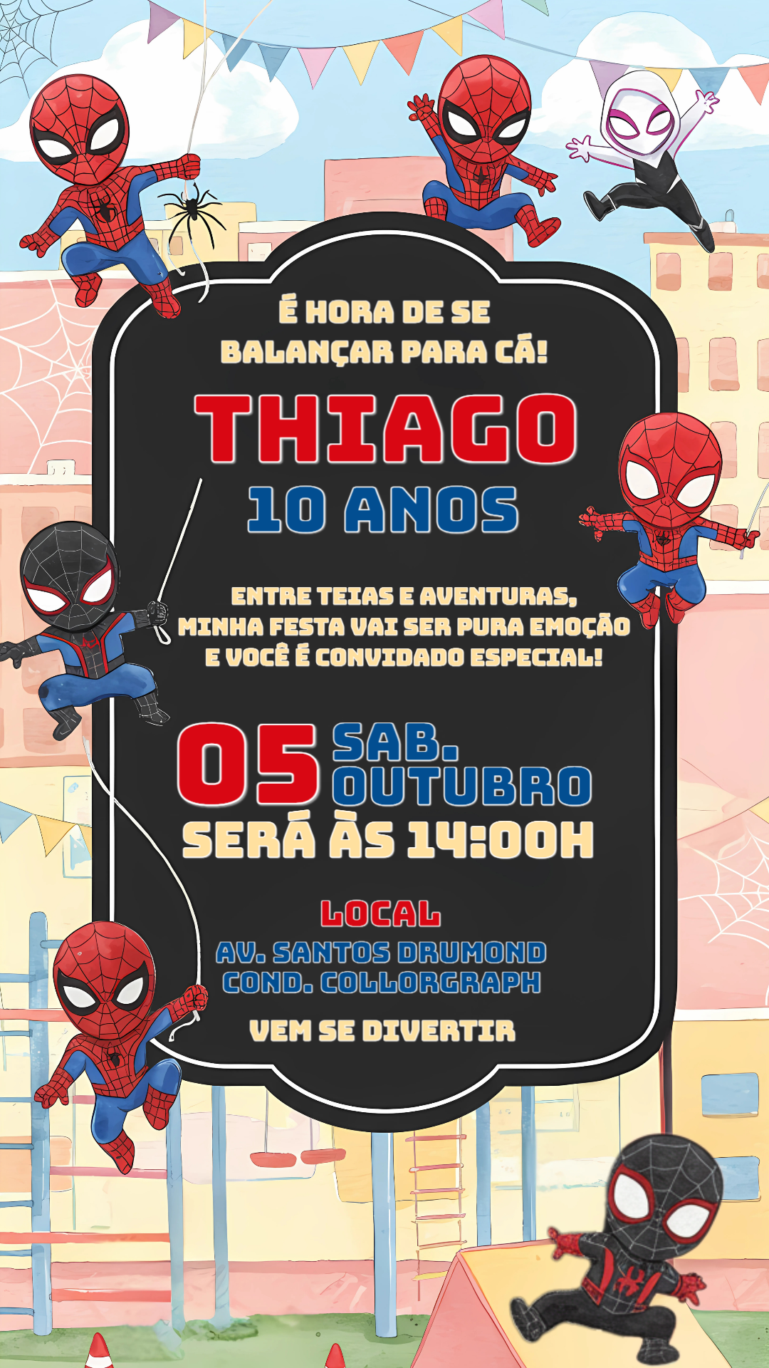 Chame toda a turma para uma aventura com o Homem-Aranha, Miles Morales e Spider-Gwen! Edite online em minutos e envie para seus convidados.