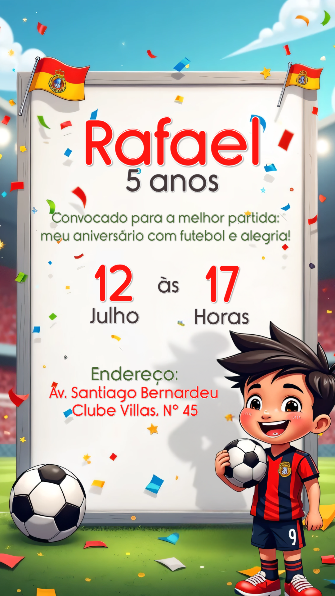 Prepare-se para uma festa de campeão! Este convite de aniversário com tema de futebol é perfeito para convocar a galera para a sua comemoração. Com um design vibrante e divertido, mostrando um jovem craque em um estádio lotado, a animação já começa no convite. Personalize online em minutos! Adicione o nome do aniversariante, a idade, a data, o horário e o local da festa. É super fácil e rápido. Depois de editar, baixe o arquivo na hora e envie pela internet para seus amigos e familiares ou imprima para uma entrega especial. Garanta já o seu e marque um golaço na organização da sua festa