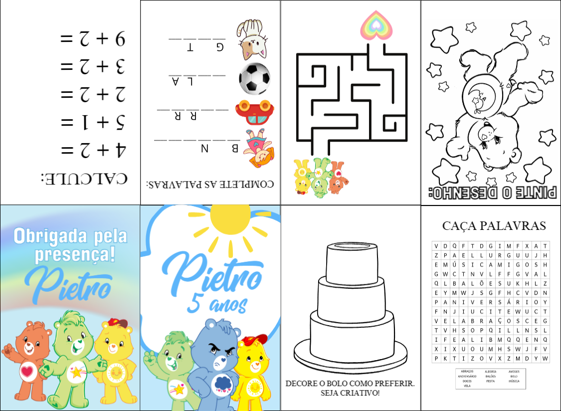 Crie uma lembrancinha inesquecível! Edite online este livrinho de atividades dos Ursinhos Carinhosos com o nome e idade do aniversariante.