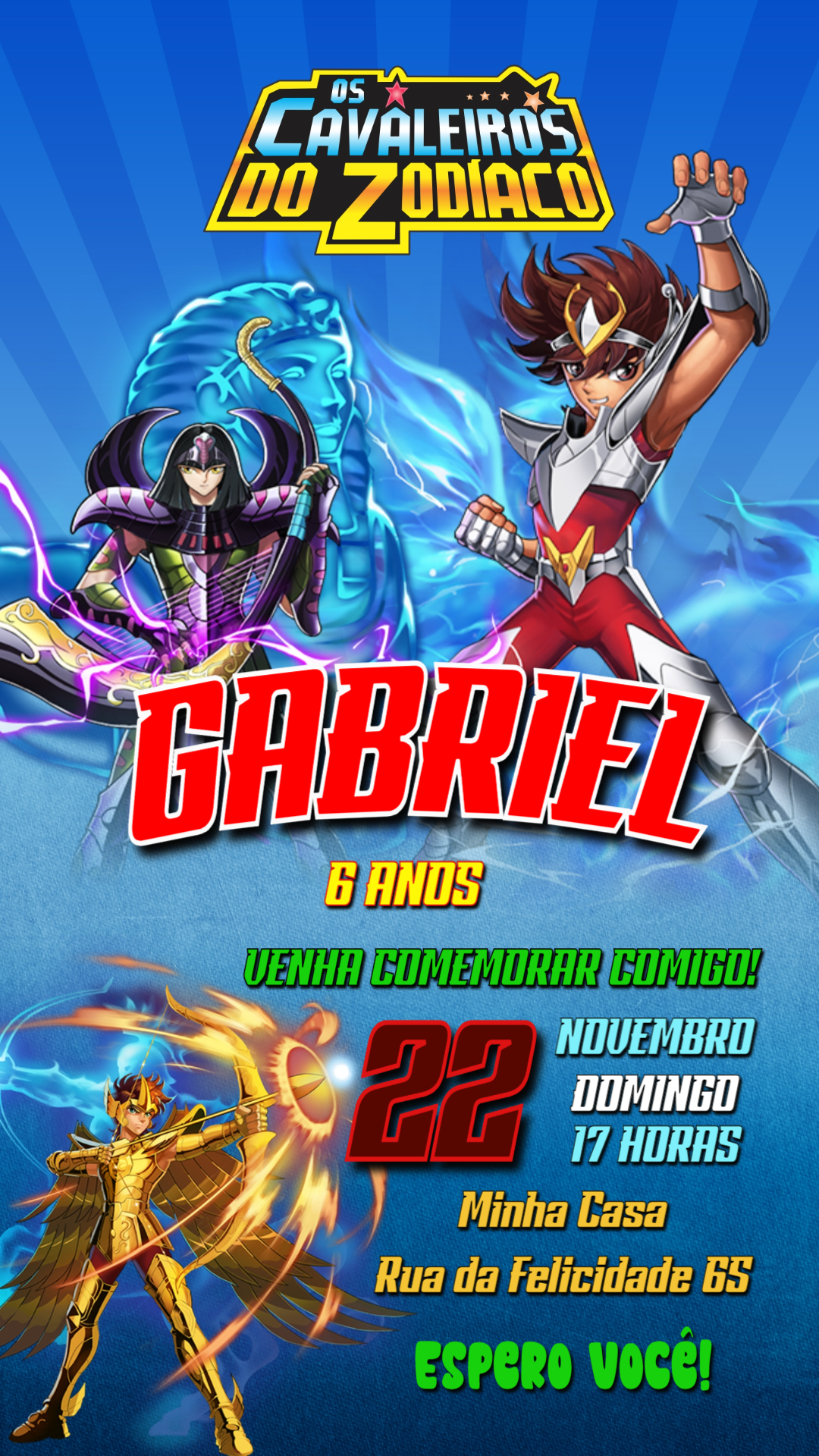 Chame todos para sua festa épica com este convite dos Cavaleiros do Zodíaco! Personalize online em minutos pelo celular ou computador.
