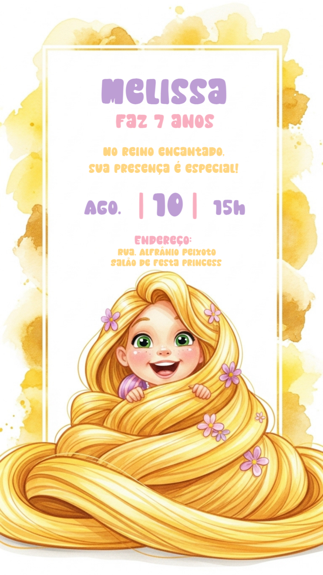 Encante seus convidados com um convite mágico da Rapunzel! Personalize online com os dados da sua festa e envie por redes sociais.