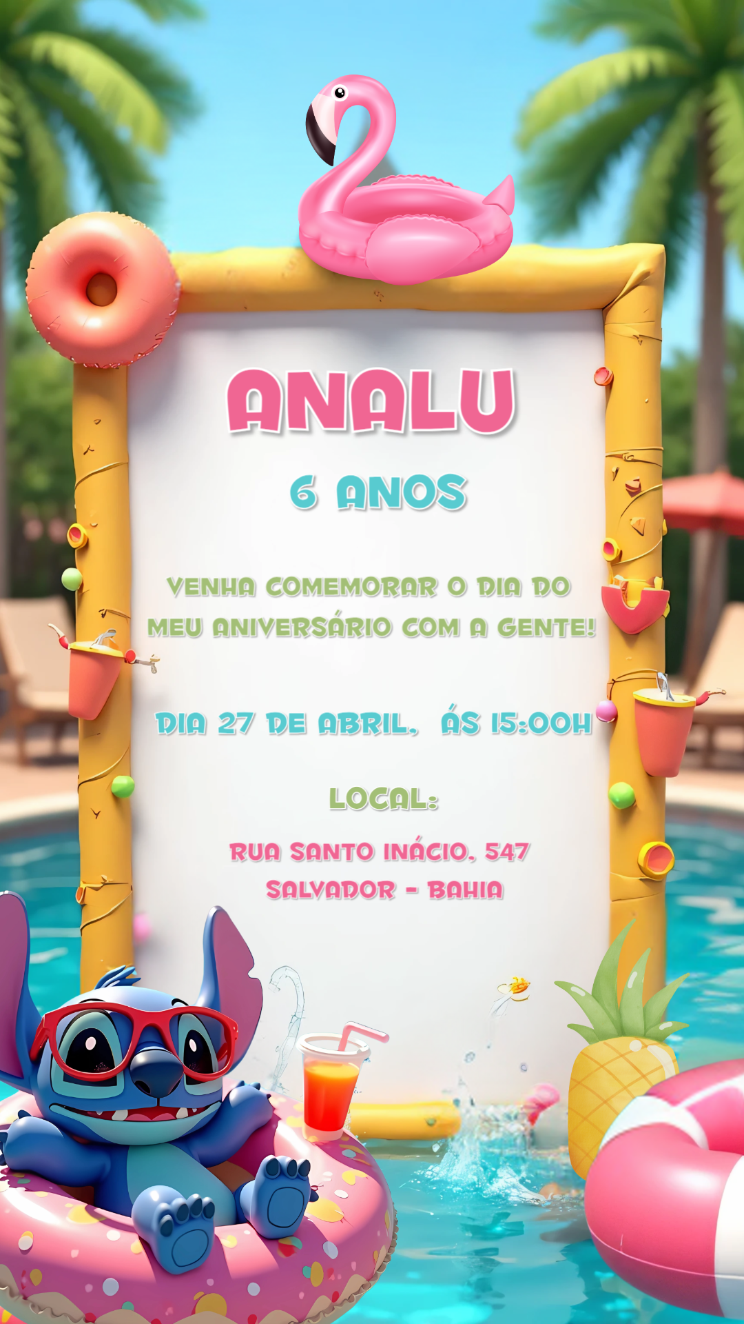 Mergulhe na diversão com este convite de aniversário temático Stitch Pool Party! Com o adorável Stitch relaxando na piscina, boias coloridas e um clima tropical vibrante, é a escolha perfeita para uma festa de verão inesquecível. Personalize seu convite em minutos! Edite online de forma fácil e rápida, inserindo o nome do aniversariante, idade, data, horário e local da comemoração. Após finalizar, baixe o arquivo em alta qualidade para enviar digitalmente aos seus convidados ou para imprimir. Crie um convite único e prepare-se para uma celebração cheia de alegria e sol
