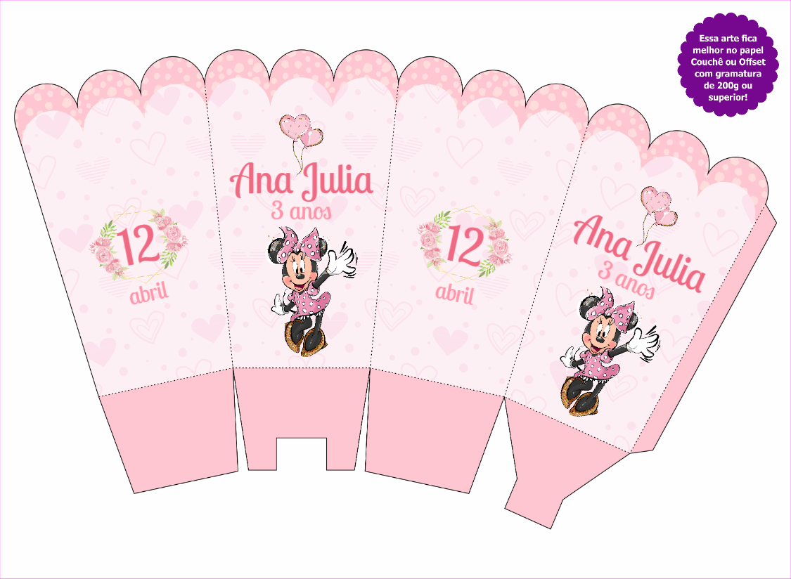 Personalize online esta linda caixinha de pipoca da Minnie Rosa. Edite com o nome e idade, imprima e decore sua festa de forma única e especial!