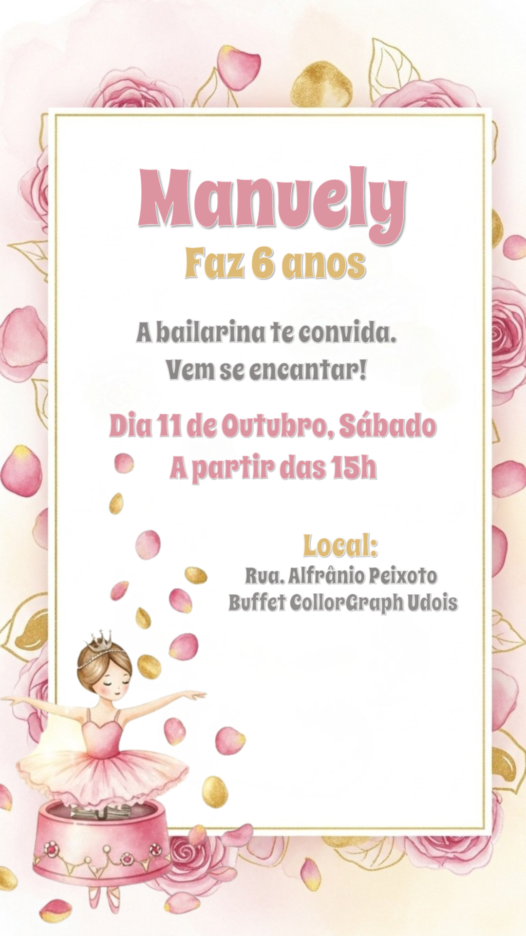 Encante seus convidados com este delicado convite de aniversário com tema bailarina! Perfeito para uma celebração mágica, o design apresenta uma linda bailarina em sua caixinha de música, com flores em tons de rosa e detalhes dourados. Crie seu convite personalizado em instantes! Edite online de forma fácil e rápida, adicionando o nome da aniversariante, idade, data, horário e local da festa. Após a personalização, o download é imediato. Você pode enviar o convite digitalmente por suas redes sociais e aplicativos de mensagem ou imprimir em alta qualidade para entregar em mãos. Torne a festa da sua pequena bailarina inesquecível desde o primeiro momento