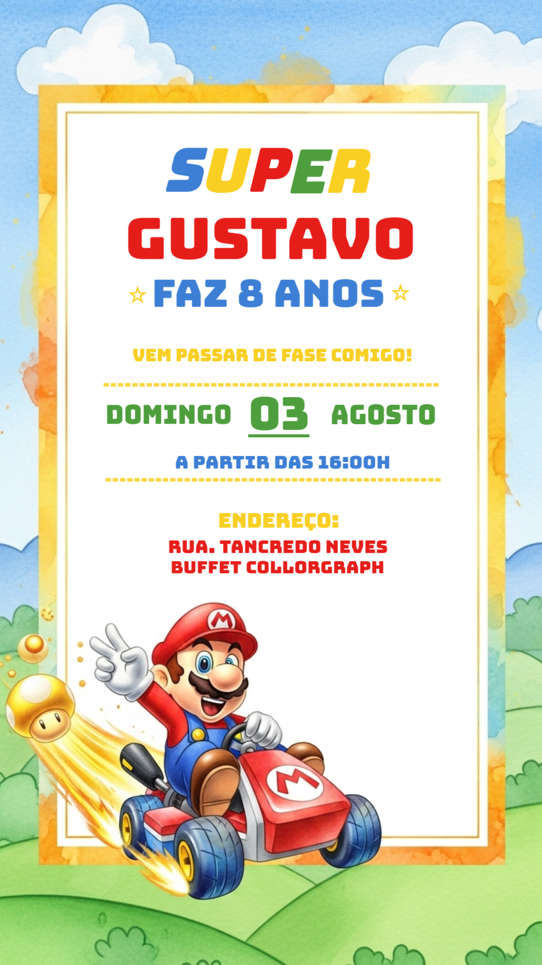 Prepare-se para uma aventura de aniversário inesquecível com este convite temático do Super Mario! Com um design vibrante e divertido, estrelando o Mario em seu kart, este convite é a maneira perfeita de chamar os amigos para a sua festa. A edição é super fácil e rápida, diretamente no nosso site! Personalize com o nome do aniversariante, a idade que ele está completando, e adicione todas as informações da festa, como data, horário e endereço. Após a personalização, o download é instantâneo! Você pode enviar seu convite digitalmente pelas redes sociais e aplicativos de mensagem, ou imprimir para entregar em mãos. Crie um convite incrível e convide todos para passar de fase com você