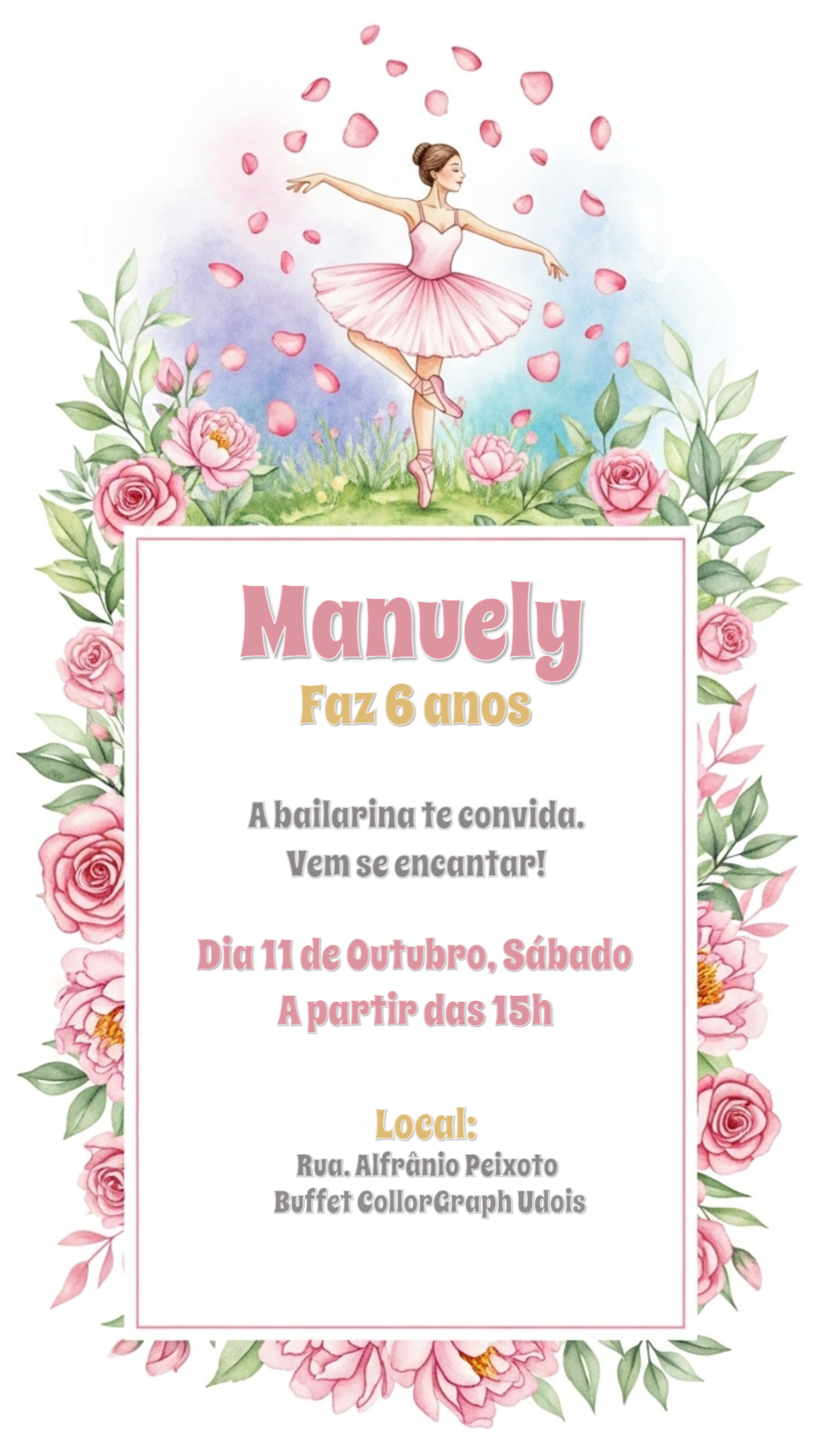Encante seus convidados com este delicado convite de aniversário com tema bailarina! O design em aquarela com flores cor-de-rosa cria uma atmosfera mágica e sonhadora para a sua celebração. A melhor parte? Você edita online de forma fácil e rápida! Personalize com o nome da aniversariante, idade, data, horário e local da festa. Após a edição, o download é imediato. Perfeito para enviar digitalmente aos seus convidados ou para imprimir e entregar em mãos. Crie um convite único em minutos e prepare-se para uma festa inesquecível