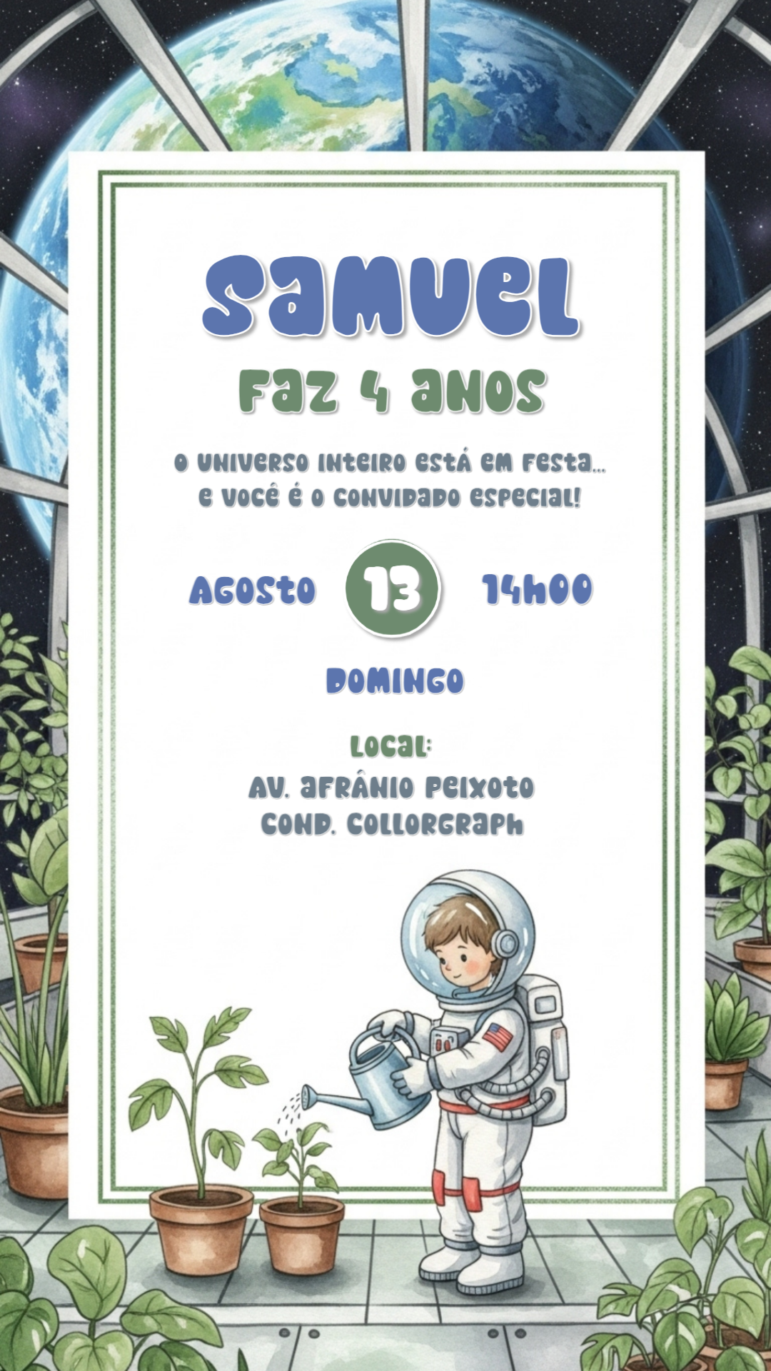 Embarque em uma aventura espacial com um convite infantil tema Astronauta. Com ilustrações de planetas, estrelas e foguetes, ele desperta a imaginação e alegria das crianças. Mães podem personalizar online em minutos e baixar na hora, tornando o processo prático e rápido. Cada detalhe do convite foi pensado para criar um clima divertido, aventureiro e cheio de descobertas. Ideal para aniversários que buscam criatividade, emoção e momentos inesquecíveis para todos os convidados. convite Astronauta, convite infantil digital, convite festa temática espaço, convite online infantil, convite criativo Astronauta, convite divertido para crianças, convite para imprimir foguete, convite personalizável online, convite aniversário espacial, convite festa cósmica