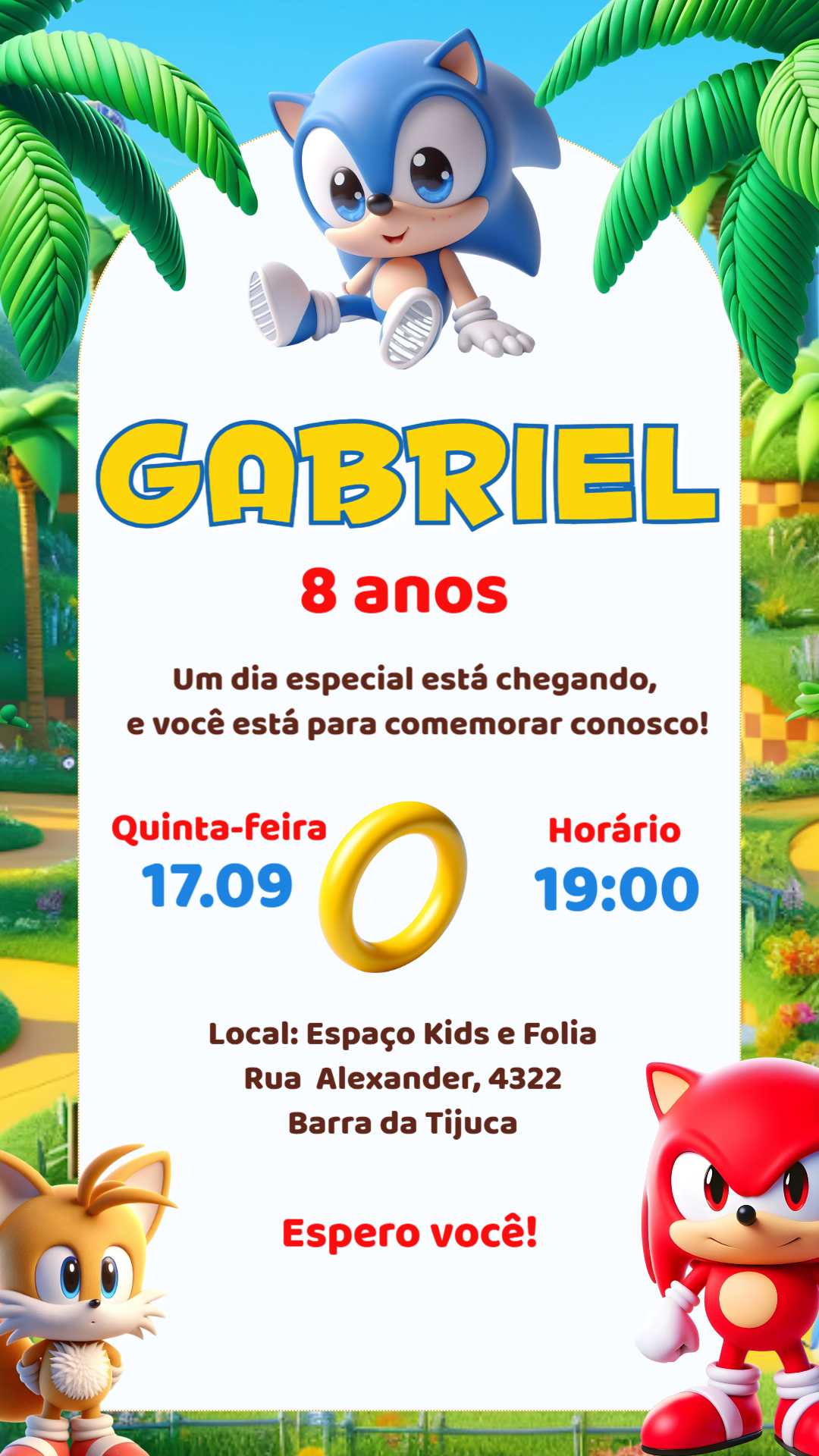 Crie um convite personalizado do Sonic Baby em minutos! Edite online pelo celular ou PC e envie para seus convidados pelas redes sociais.