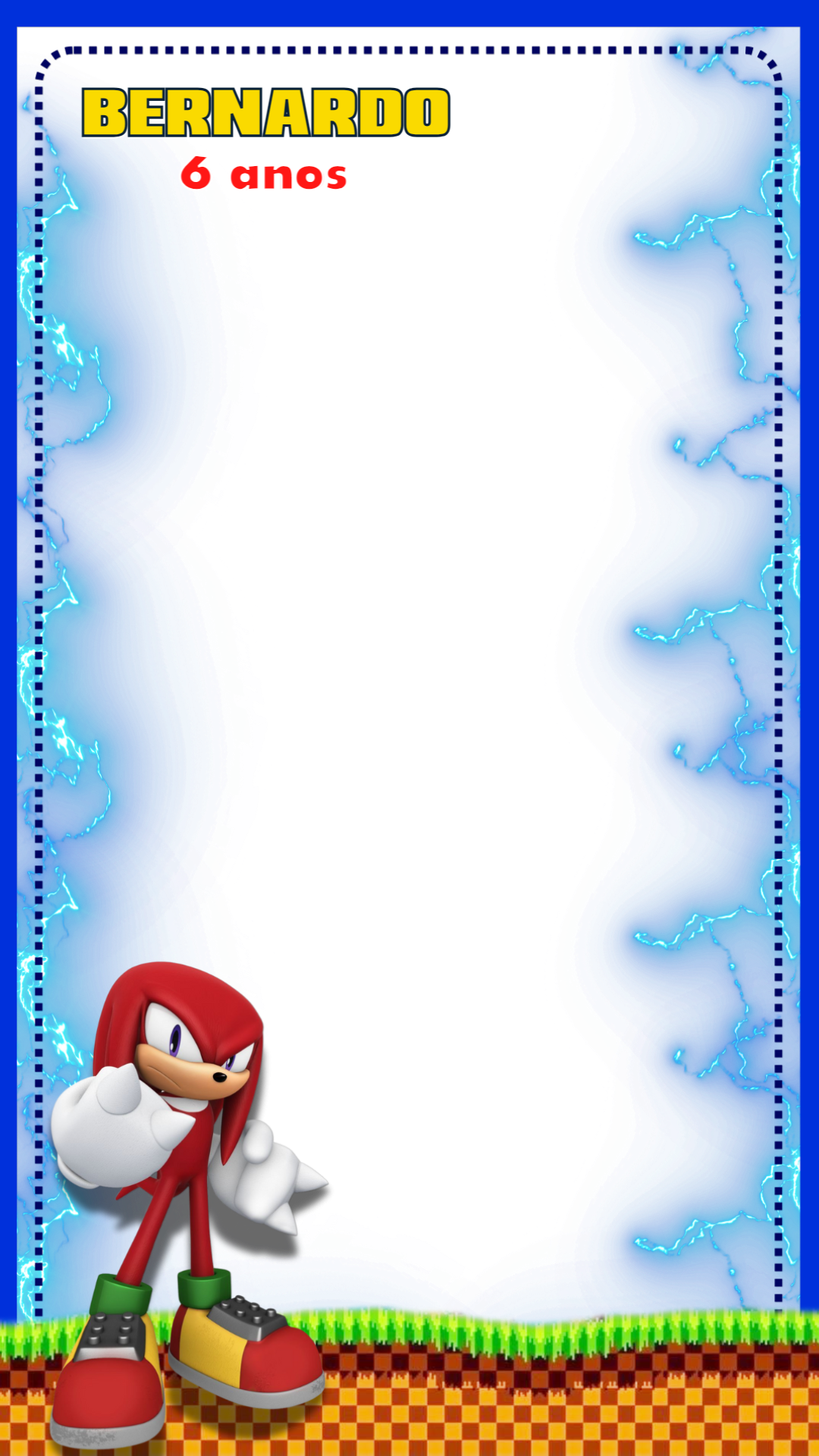 Crie uma moldura de story incrível para sua festa com o tema Knuckles! Personalize online com sua foto e texto em poucos cliques.