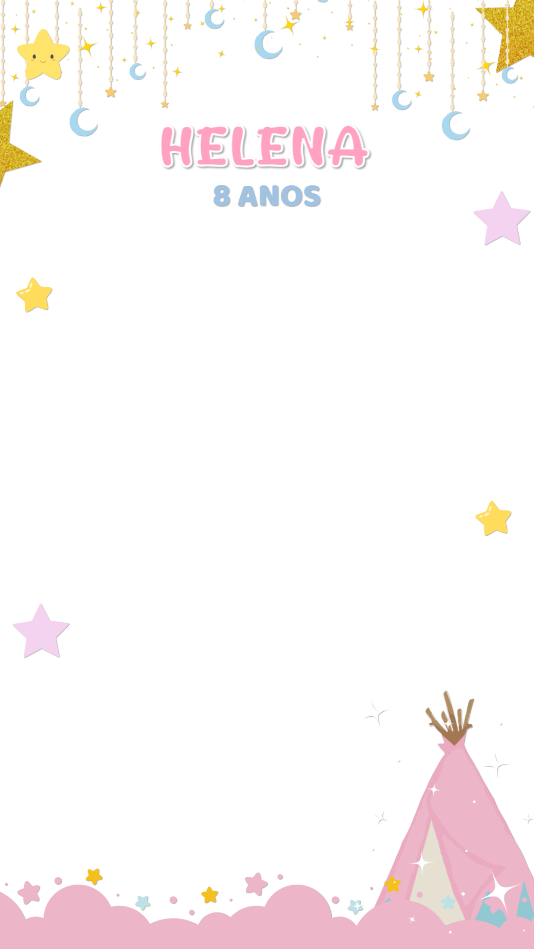 Crie uma linda moldura para stories com tema céu estrelado. Personalize com nome e idade para celebrar um aniversário mágico e encantador.