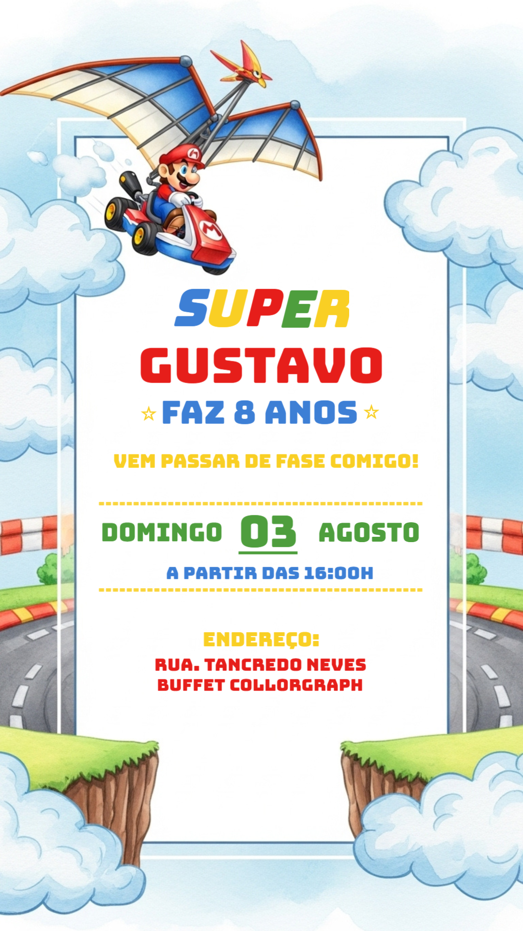 Prepare-se para uma aventura em alta velocidade! Este convite de aniversário digital com o tema Super Mario Kart é perfeito para uma festa cheia de ação e diversão. O design vibrante mostra o Mario voando em seu kart, criando o clima ideal para uma celebração inesquecível. Personalize você mesmo online de forma rápida e fácil! Altere o nome do aniversariante, idade, data, horário e o endereço da festa. Em poucos minutos, seu convite exclusivo está pronto. Após a edição, o download é imediato, permitindo que você envie pelas redes sociais ou imprima para entregar aos seus convidados. Crie um convite incrível e chame todos para passar de fase com você