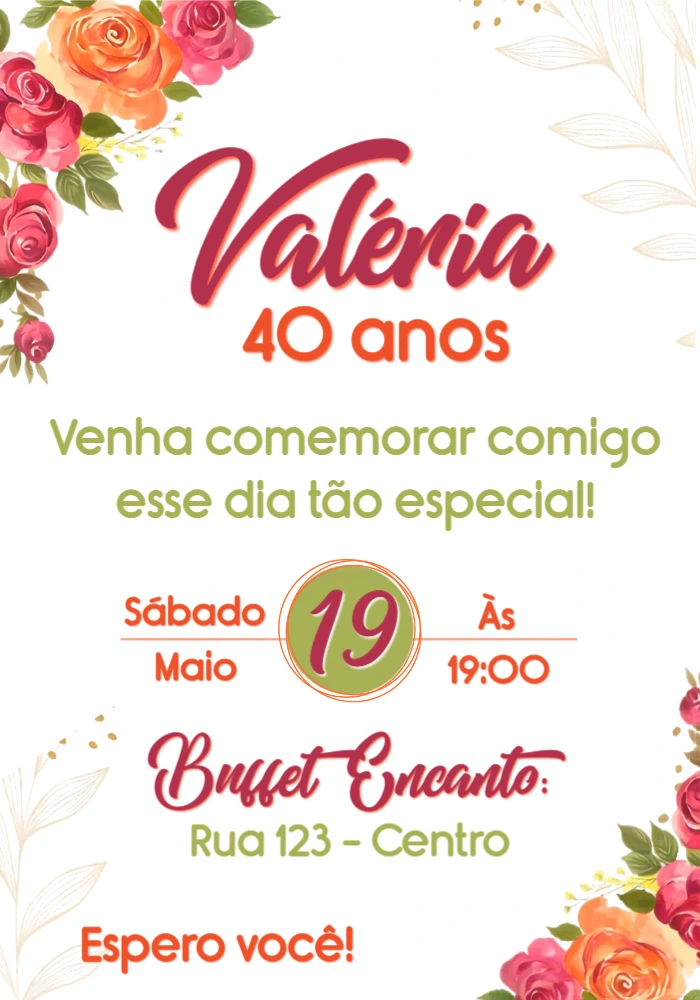 Celebre mais um ano de vida com um convite que reflete sua elegância e alegria! Este modelo de convite digital para aniversário adulto é perfeito para comemorar datas especiais, como 30, 40 ou 50 anos. Com um design floral encantador, apresentando rosas em tons vibrantes de laranja e rosa, ele transmite sofisticação e feminilidade. A personalização é super simples: você pode editar todos os textos, incluindo o nome da aniversariante, idade, data, horário e local da festa. Crie seu convite online em poucos minutos, baixe e envie para seus convidados por mensageiros, redes sociais ou e-mail. Se preferir, também pode imprimir para uma entrega mais tradicional. Surpreenda a todos com um convite lindo e prático!