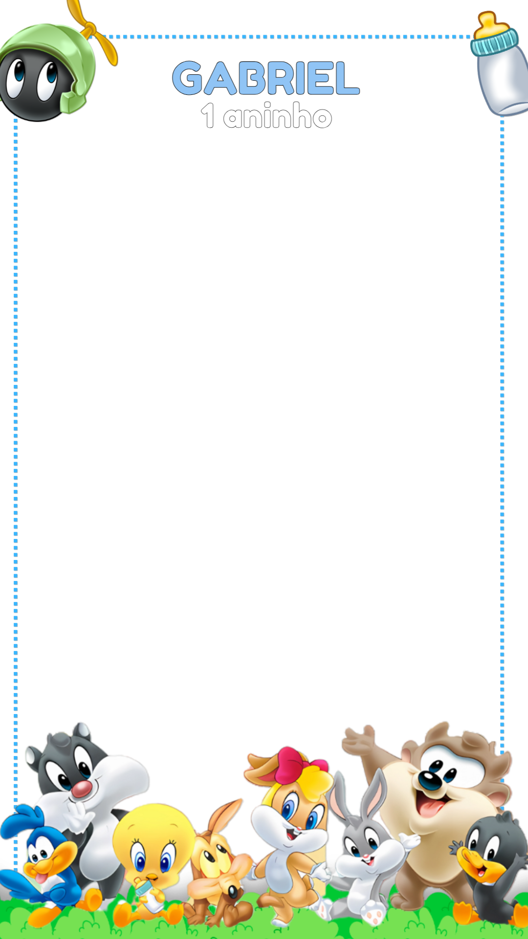 Crie uma linda moldura para stories de aniversário com os personagens do Baby Looney Tunes. Personalize com nome e idade de forma fácil e rápida!
