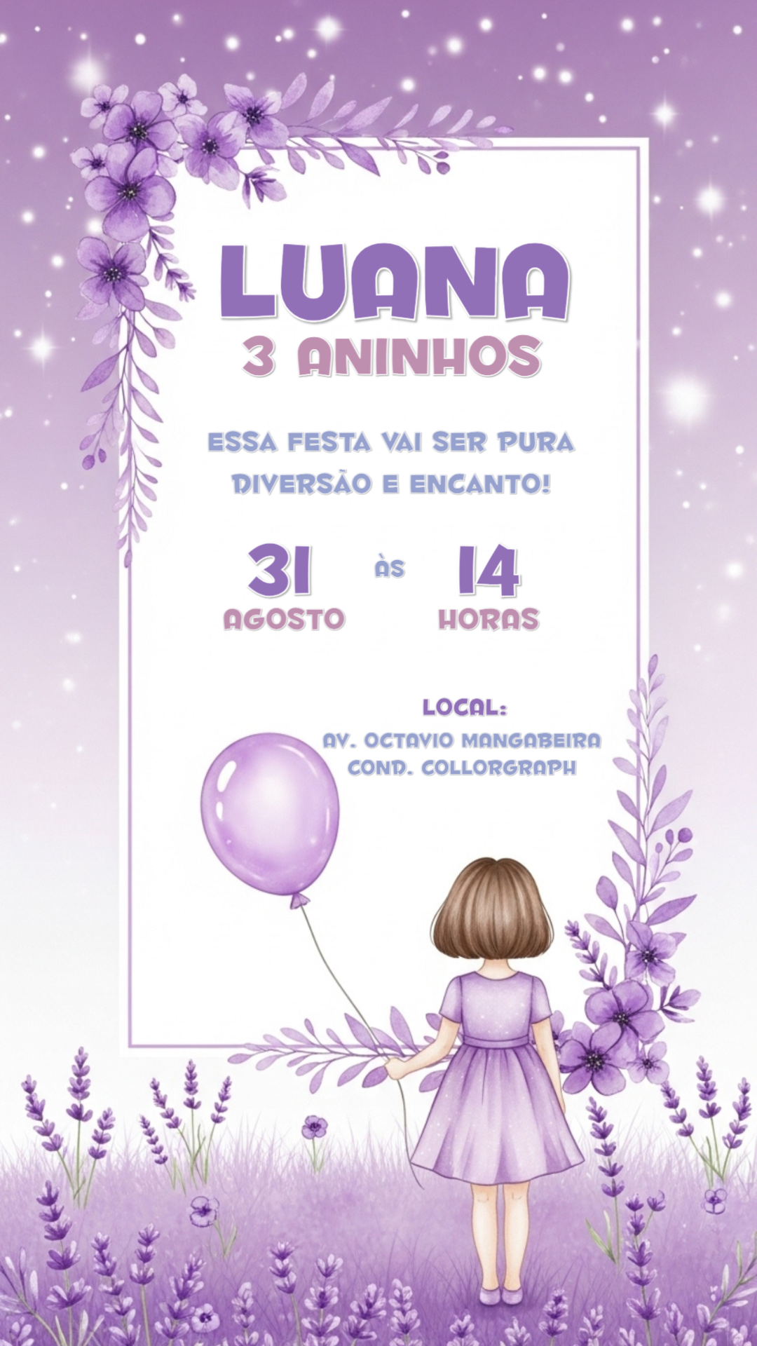 Celebre um aniversário mágico com o nosso convite do tema Jardim Encantado! Com um design delicado em tons de lilás e lavanda, esta arte apresenta uma linda menina em um campo de flores, criando uma atmosfera de sonho e encanto para a sua festa. Personalize você mesmo de forma fácil e rápida! Edite online em minutos: adicione o nome da aniversariante, a idade, a data, o horário e o local da celebração. Após a edição, o download é imediato! Perfeito para enviar online aos seus convidados ou para imprimir em alta qualidade. Crie um convite único e comece a festejar com este tema adorável