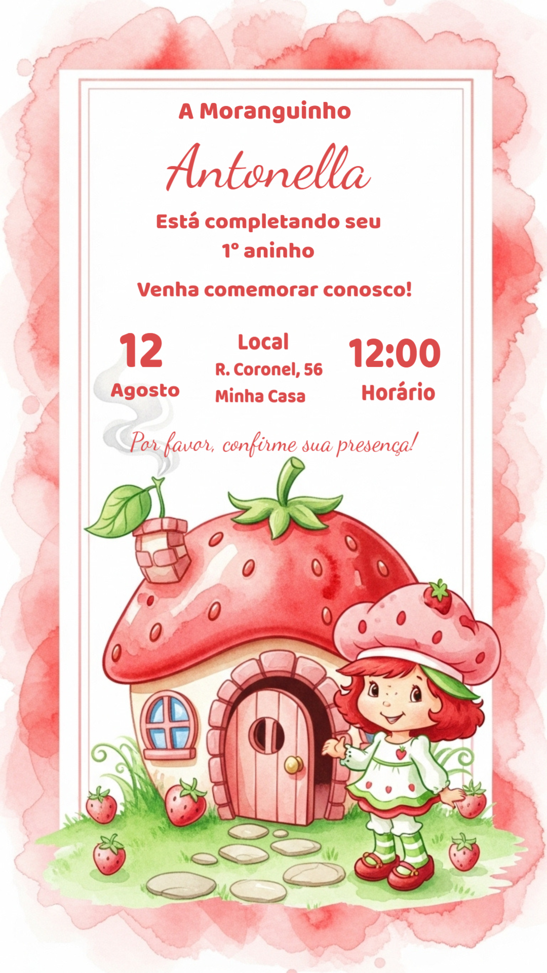 Crie um convite encantador com a Moranguinho! Personalize facilmente online com os dados da sua festa e envie para todos os convidados.