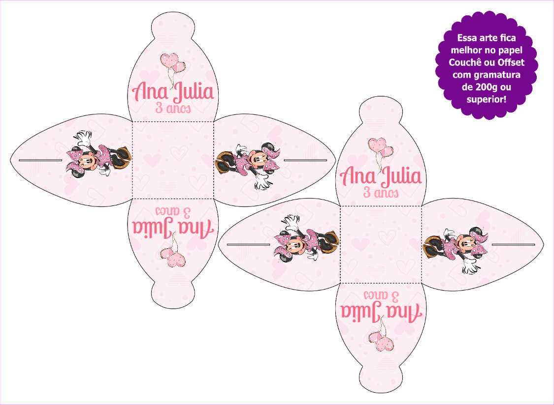 Personalize esta linda caixinha da Minnie Rosa com nome e idade. Edite online em minutos e imprima para uma festa inesquecível!