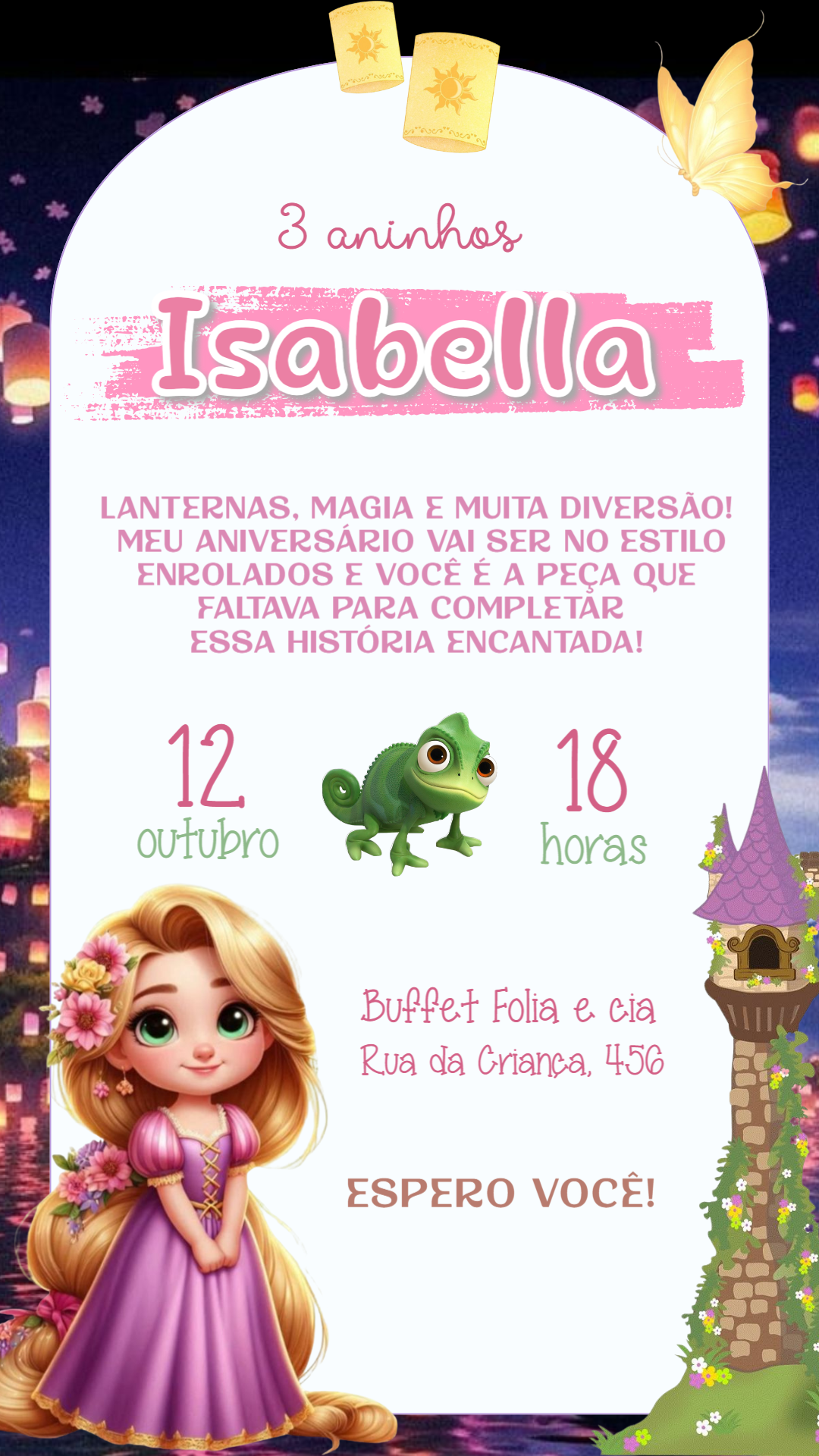 Leve a magia de Enrolados para a sua festa com este convite encantador da Rapunzel! Com um design adorável que inclui a princesa, Pascal e as icônicas lanternas flutuantes, é o convite perfeito para um aniversário de conto de fadas. Personalize online de forma rápida e fácil: insira o nome da aniversariante, a idade, a data, o horário e o endereço da celebração. Após a edição, seu convite fica pronto para baixar na hora, em alta qualidade! Ideal para compartilhar digitalmente com amigos e familiares ou para imprimir e entregar em mãos. Crie agora mesmo e surpreenda seus convidados com um toque de encanto e diversão