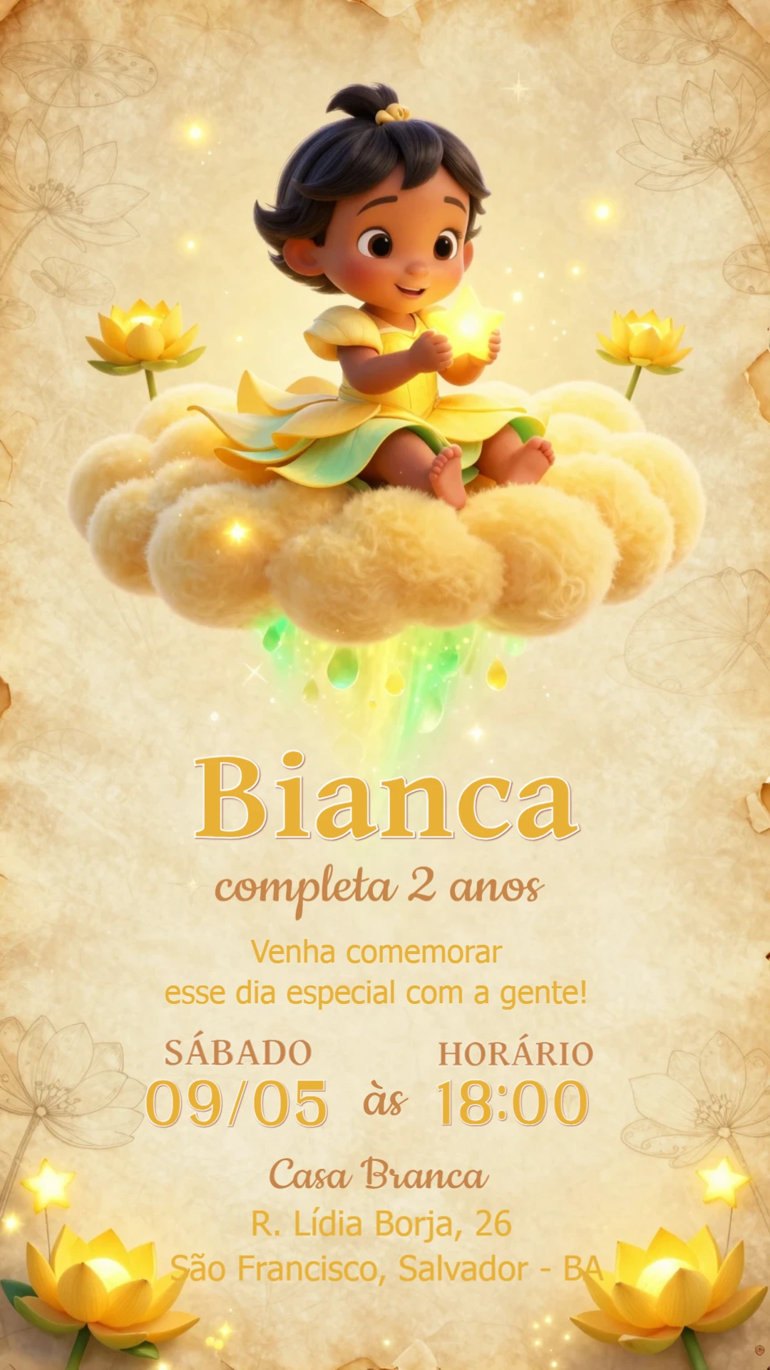 Transforme a festa de aniversário da sua filha em um conto de fadas com este convite digital encantador! Inspirado na magia da Princesa Tiana em sua versão bebê, este design é pura doçura e delicadeza. Com um fundo que remete a um pergaminho antigo, ilustrações de flores de lótus e uma paleta de cores quentes em tons de amarelo e dourado, é o convite perfeito para uma celebração especial. Personalize facilmente todos os detalhes online: altere o nome da aniversariante, a idade, a data, o horário e o local da festa. Em poucos cliques, você cria um convite único e profissional, pronto para impressionar. Após a edição, basta baixar o arquivo e compartilhar de forma prática e sustentável com seus amigos e familiares por meio de mensageiros digitais, redes sociais ou e-mail. Se preferir, também pode imprimir para uma entrega tradicional. Crie uma memória inesquecível desde o primeiro momento!