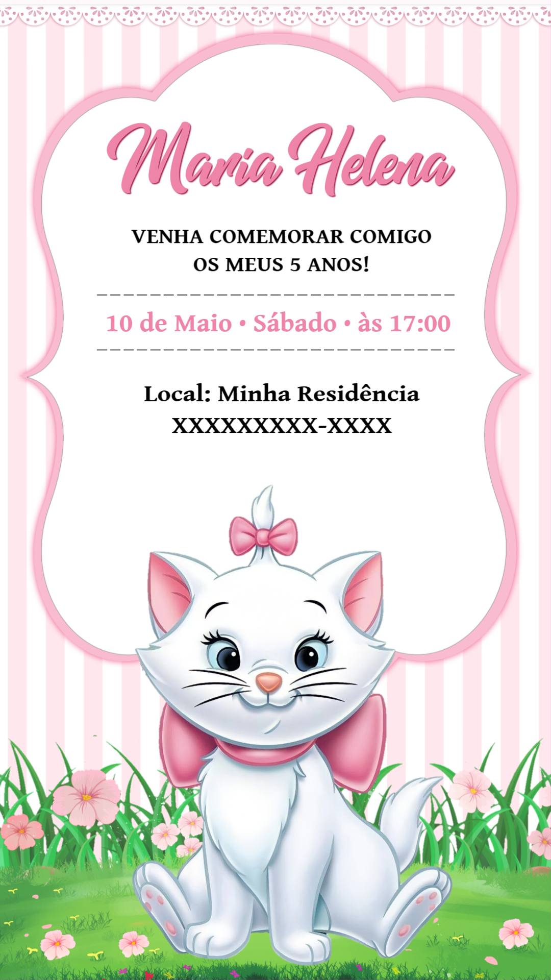 Crie um convite de aniversário encantador com a Gata Marie. Edite online em minutos e compartilhe com amigos e familiares pelas redes sociais.