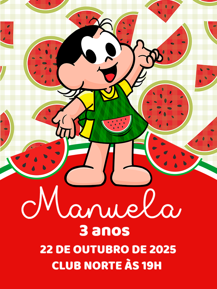 Convite digital vertical com tema da Turma da Mônica e Melancia O design apresenta a personagem Mônica em destaque com seu sorriso cativante vestindo um avental temático de melancia O fundo é decorado com um padrão xadrez suave e diversas fatias e rodelas de melancia suculentas A paleta de cores vibrantes em vermelho e verde remete à fruta e ao universo da Turma da Mônica Ideal para celebrar aniversários infantis especialmente para quem ama a personagem e temas de frutas ou verão Este convite digital oferece a conveniência de personalizar online em minutos usando nossa plataforma de edição intuitiva Após a personalização, você pode baixar na hora o arquivo final em alta resolução pronto para distribuição eletrônica Garanta uma festa fofa e cheia de sabor com este convite original e fácil de personalizar que destaca a alegria da Mônica