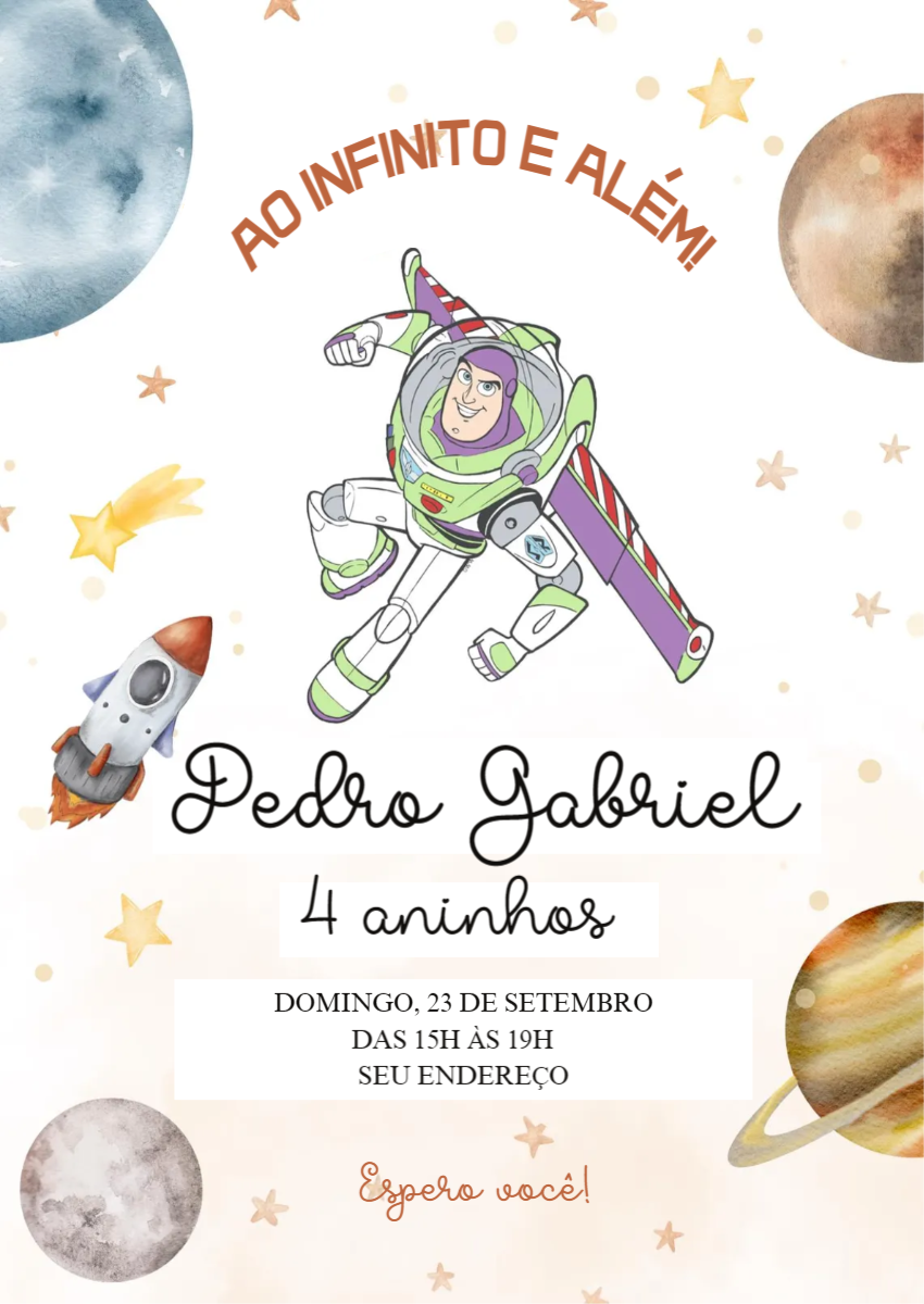 Ao infinito e além! Crie um convite digital de aniversário mágico com o tema do patrulheiro espacial e a aventura no universo. O design em aquarela apresenta o herói voando entre planetas, estrelas e foguetes, perfeito para festas infantis com o tema de espaço ou super-heróis. Personalize online em minutos com os detalhes da sua celebração e baixe na hora em alta resolução, pronto para compartilhar ou imprimir. A forma mais cósmica e fácil de convidar todos para uma jornada inesquecível! convite, aniversário, patrulheiro espacial, Buzz Lightyear, Toy Story, espaço, universo, festa temática, convite digital, foguete, planetas, estrela cadente