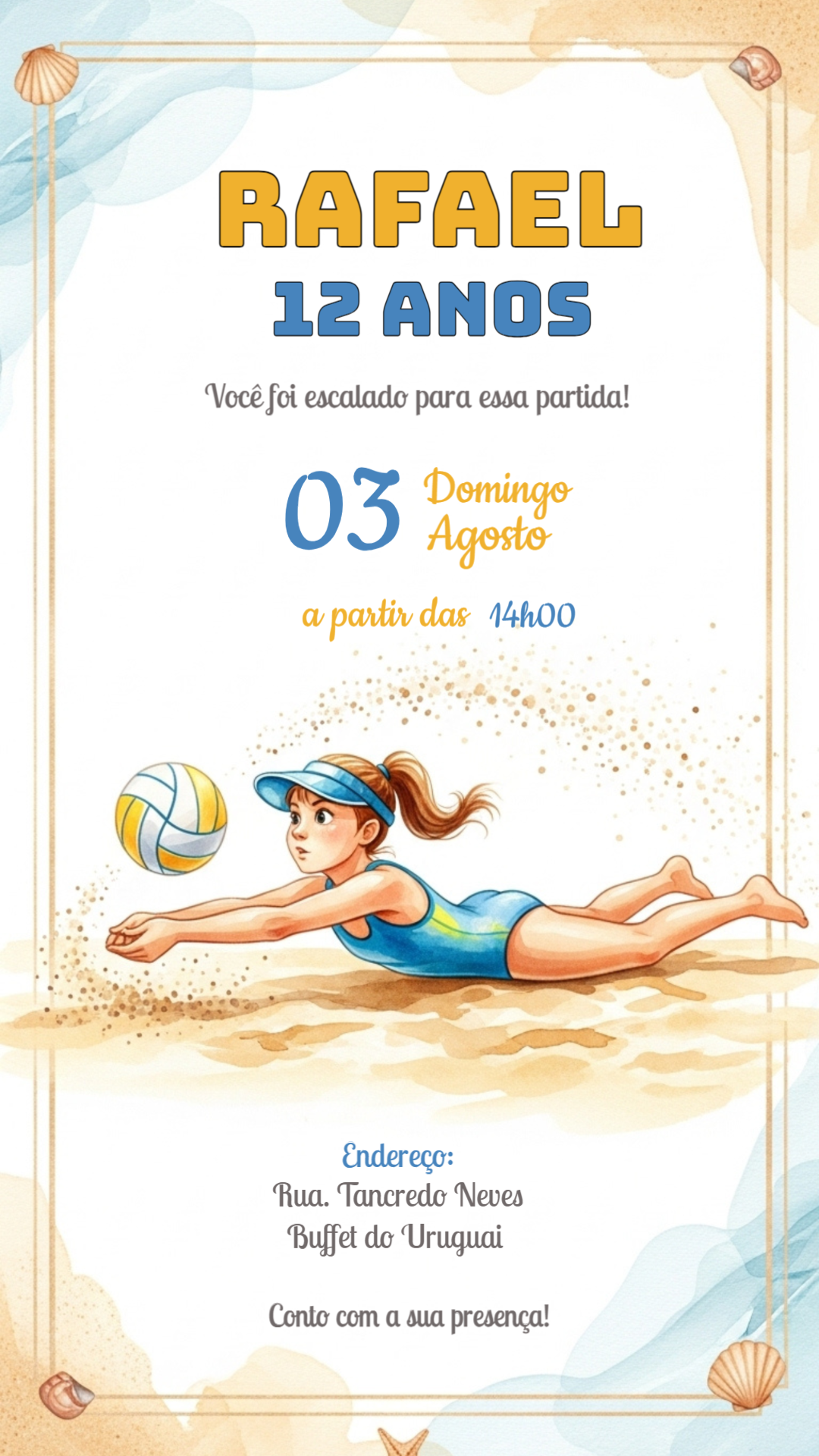 A areia está te chamando para a festa! Convite digital com o tema Vôlei de Praia (Beach Volley) em um belo estilo Aquarela, com tons de azul e areia. O design destaca uma jogadora em ação, em um cenário praiano com conchas e água, ideal para um aniversário de verão ou festa esportiva na praia. Nossa plataforma permite que você personalize este cartão de festa online em minutos com todos os detalhes do evento. Sem complicação e sem precisar de software! Conclua rapidamente e baixe o arquivo em alta resolução na hora, pronto para imprimir ou enviar digitalmente. Um convite descontraído e cheio de energia para a sua celebração na areia!