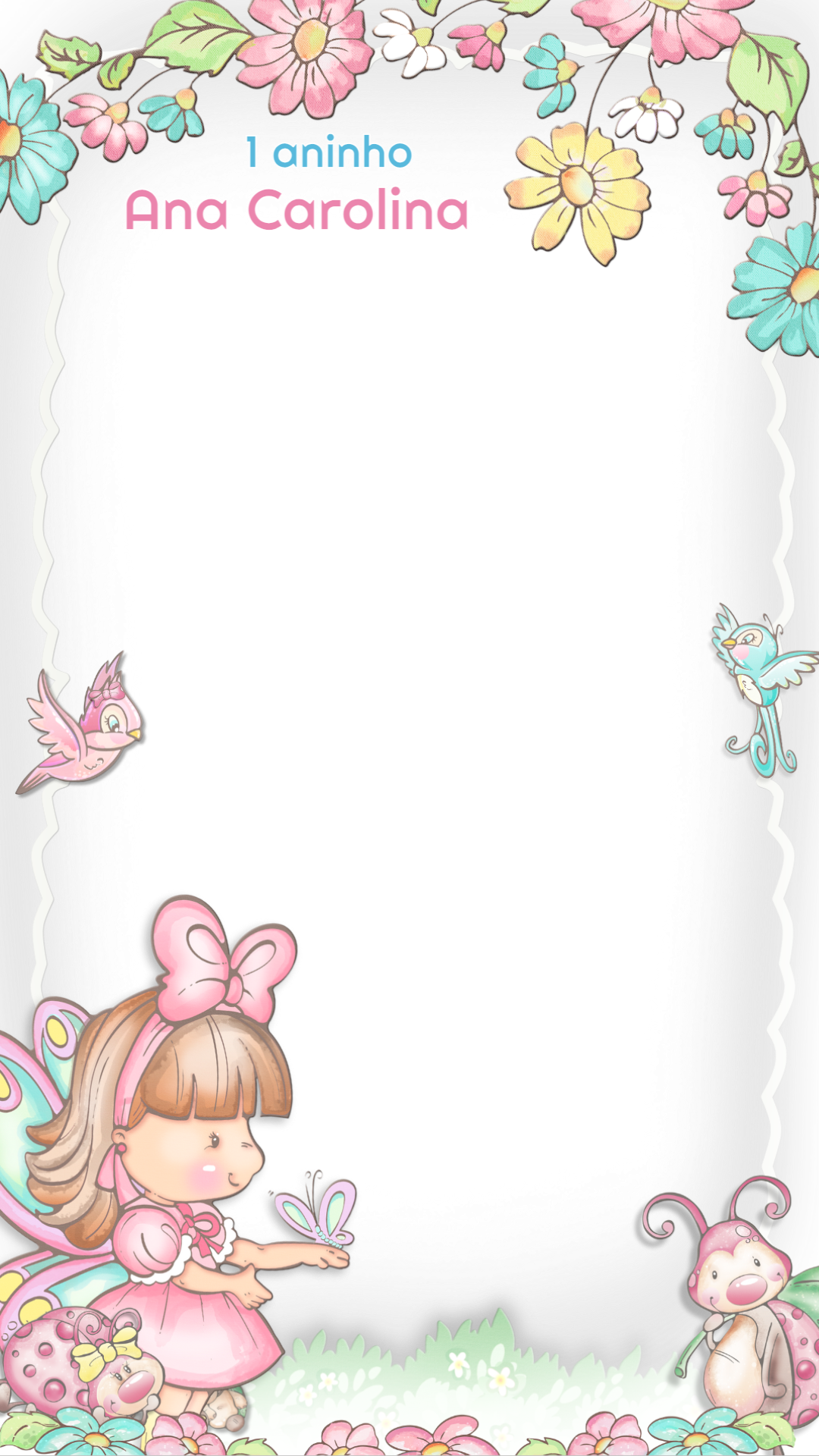 Celebre com magia e encanto! Crie uma festa inesquecível com a nossa moldura digital de fada e jardim encantado! Este modelo é ideal para quem busca um tema de festa infantil delicado e cheio de fantasia. O design apresenta uma adorável fada com asas de borboleta, flores coloridas, pássaros e uma divertida joaninha, criando um cenário perfeito para celebrar. edite e baixe em instantes troque o nome e a idade do aniversariante de forma simples e rápida. Após baixar o arquivo, use-o para criar Stories incríveis no Instagram.