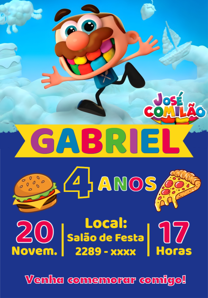 Crie um convite divertido com o tema José Comilão! Edite online em minutos, adicione os dados da festa e envie para seus convidados pelas redes sociais.