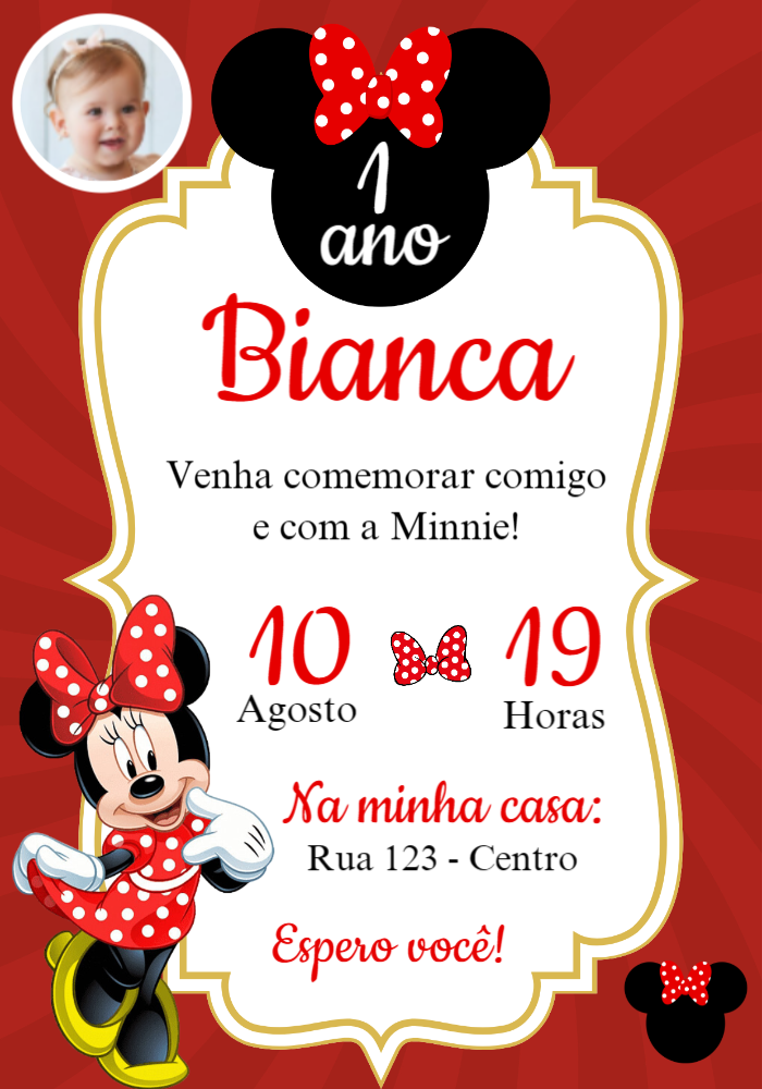 Convite Aniversário Minnie Vermelha com Foto para Editar