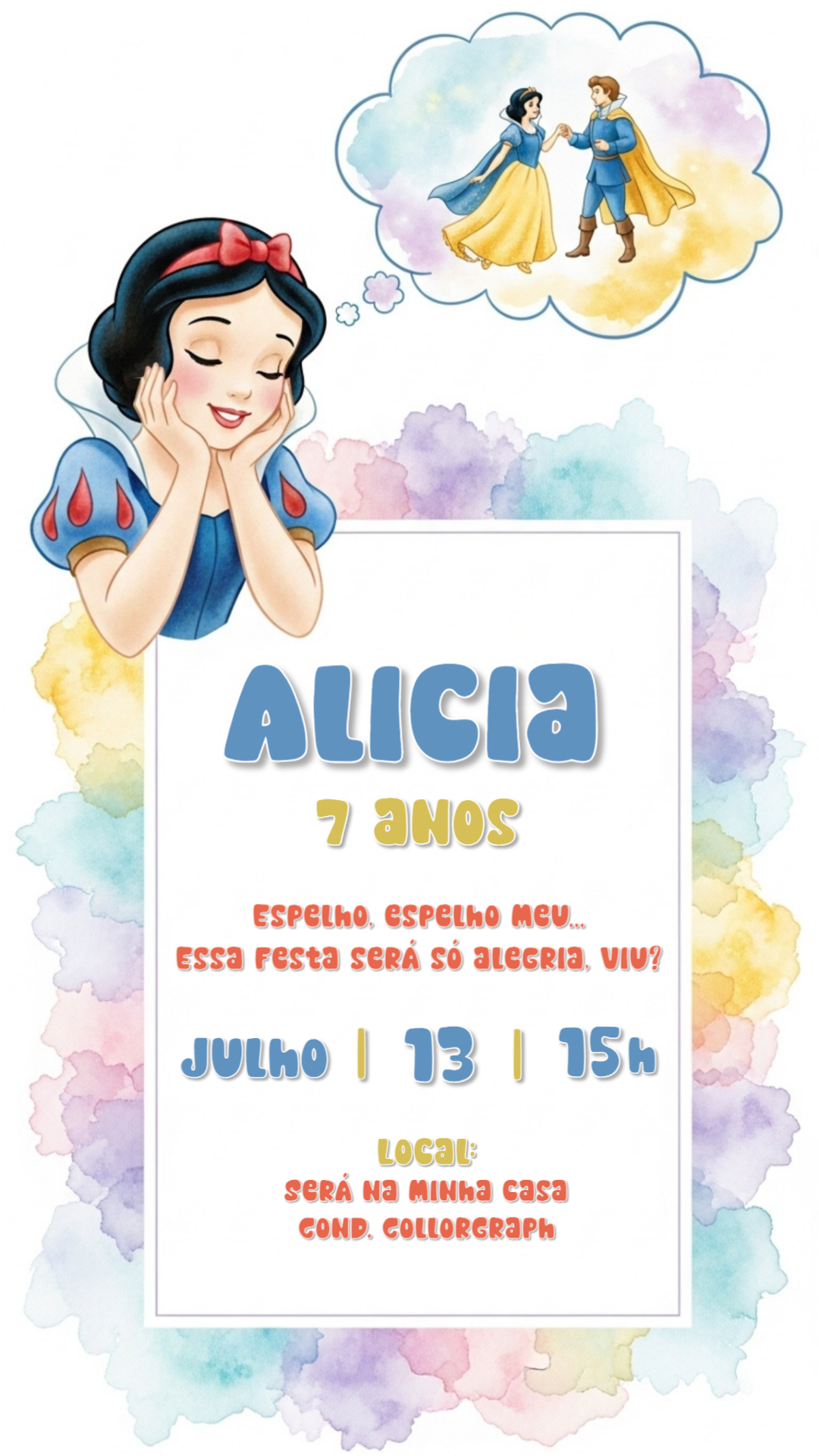 Celebre um aniversário de conto de fadas com este convite encantador da Branca de Neve! O design mágico apresenta a princesa sonhando com seu príncipe, sobre um delicado fundo de aquarela colorida. Personalize online em poucos cliques: adicione o nome da aniversariante, idade, data, horário e todas as informações da sua festa. É rápido e fácil! Após a edição, seu convite fica pronto para baixar na hora. Perfeito para imprimir em casa ou enviar digitalmente para seus convidados. Crie uma memória inesquecível desde o primeiro momento