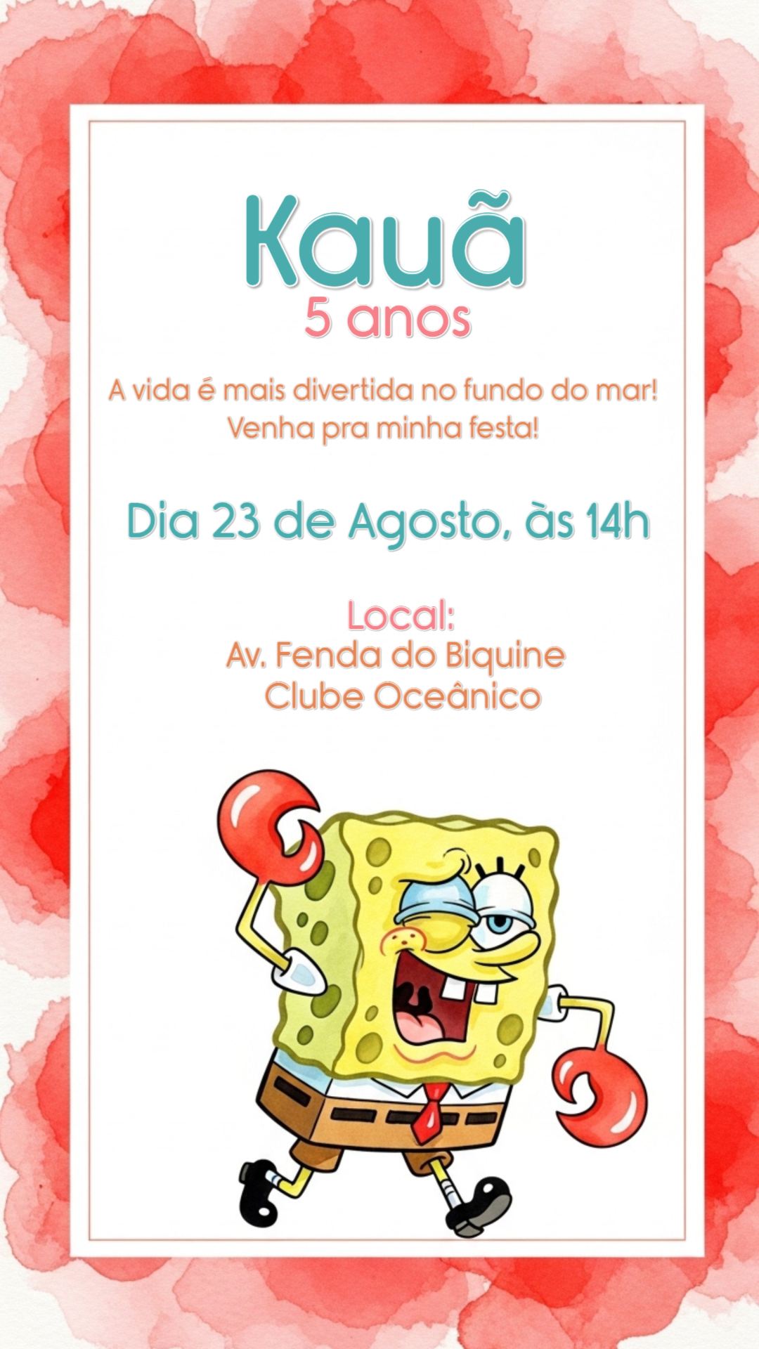 Mergulhe na diversão com este convite de aniversário temático do Bob Esponja! Com um design alegre e uma borda em aquarela vibrante, é a escolha perfeita para uma festa inesquecível no fundo do mar. Personalize seu convite em poucos cliques! Edite online de forma fácil e rápida, adicionando o nome do aniversariante, idade, data, hora e local do evento. Não precisa esperar: após a edição, seu convite fica pronto para download imediato. Surpreenda seus convidados! Envie pela internet, compartilhe nas redes sociais ou imprima em alta qualidade para uma entrega especial. Crie agora e prepare-se para a melhor festa da Fenda do Biquíni