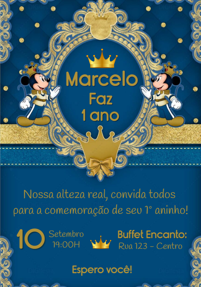 Celebre com estilo e elegância usando este convite digital Mickey Realeza Príncipe, um modelo encantador em azul marinho e dourado, perfeito para festas infantis com tema realeza. O design traz o Mickey vestido como príncipe em um cenário luxuoso, ideal para destacar todos os detalhes do evento. Personalize online em poucos minutos e tenha um convite pronto para compartilhar, com visual sofisticado e cheio de magia Disney. Edite e baixe em instantes! Perfeito para enviar nas redes sociais. Surpreenda os seus convidados! convite Mickey Príncipe, convite digital azul e dourado, convite infantil Mickey luxo, convite festa príncipe, convite realeza infantil, convite Mickey editável online