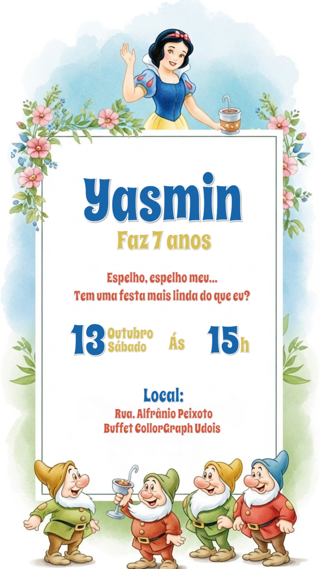 Celebre um aniversário de conto de fadas com este convite encantador da Branca de Neve! Com um lindo design em aquarela, a presença da princesa e dos Sete Anões, este convite é a escolha perfeita para uma festa mágica e inesquecível. A melhor parte? Você personaliza online de forma rápida e fácil! Adicione o nome da aniversariante, a idade que ela está completando, a data, o horário e o local da comemoração. Em poucos minutos, você cria um convite único e especial. Após finalizar a edição, o download é imediato. O convite fica pronto para ser compartilhado online com amigos e familiares ou para imprimir em alta qualidade. Comece a festa com a magia do clássico da Disney e encante todos os seus convidados
