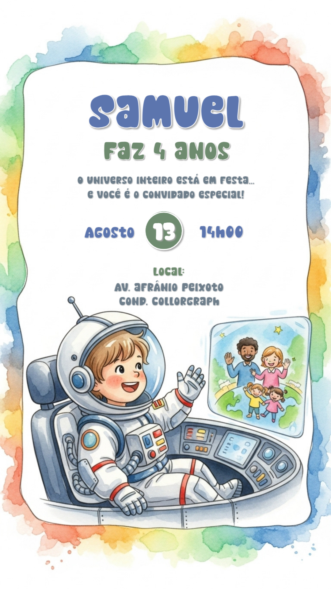 Prepare-se para uma aventura espacial! Crie um convite de aniversário personalizado com nosso astronauta e envie para todos pela internet.